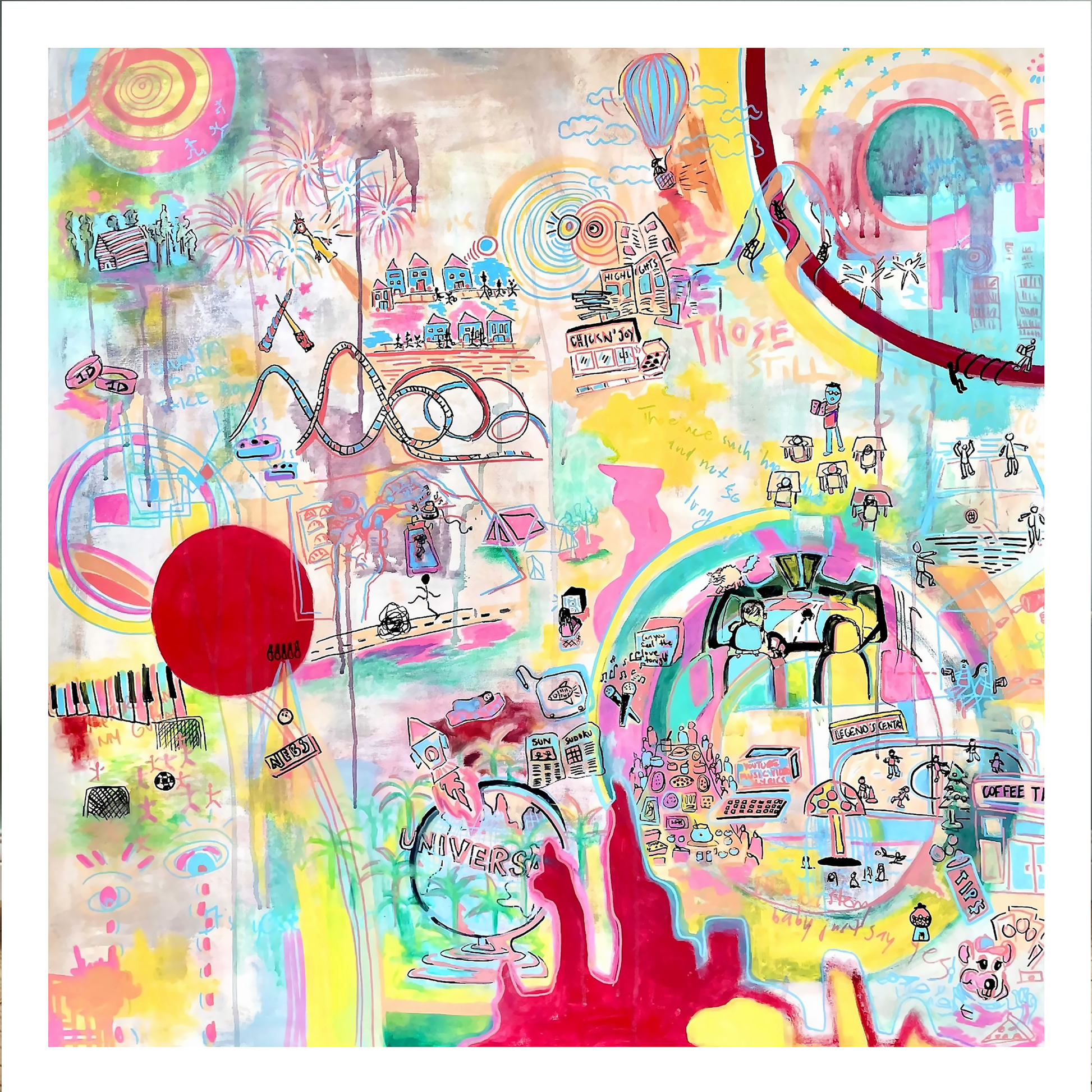 For the discerning collector, this artwork offers more than a visual feast—it is a dialogue with our collective past. The layers of playful elements—rollercoasters, fireworks, musical instruments, and everyday objects—are juxtaposed against an artistic foundation of bold compositions and delicate lines. The work is both deeply personal and universally relatable, speaking to the joys and freedoms of childhood while evoking a profound sense of nostalgia.