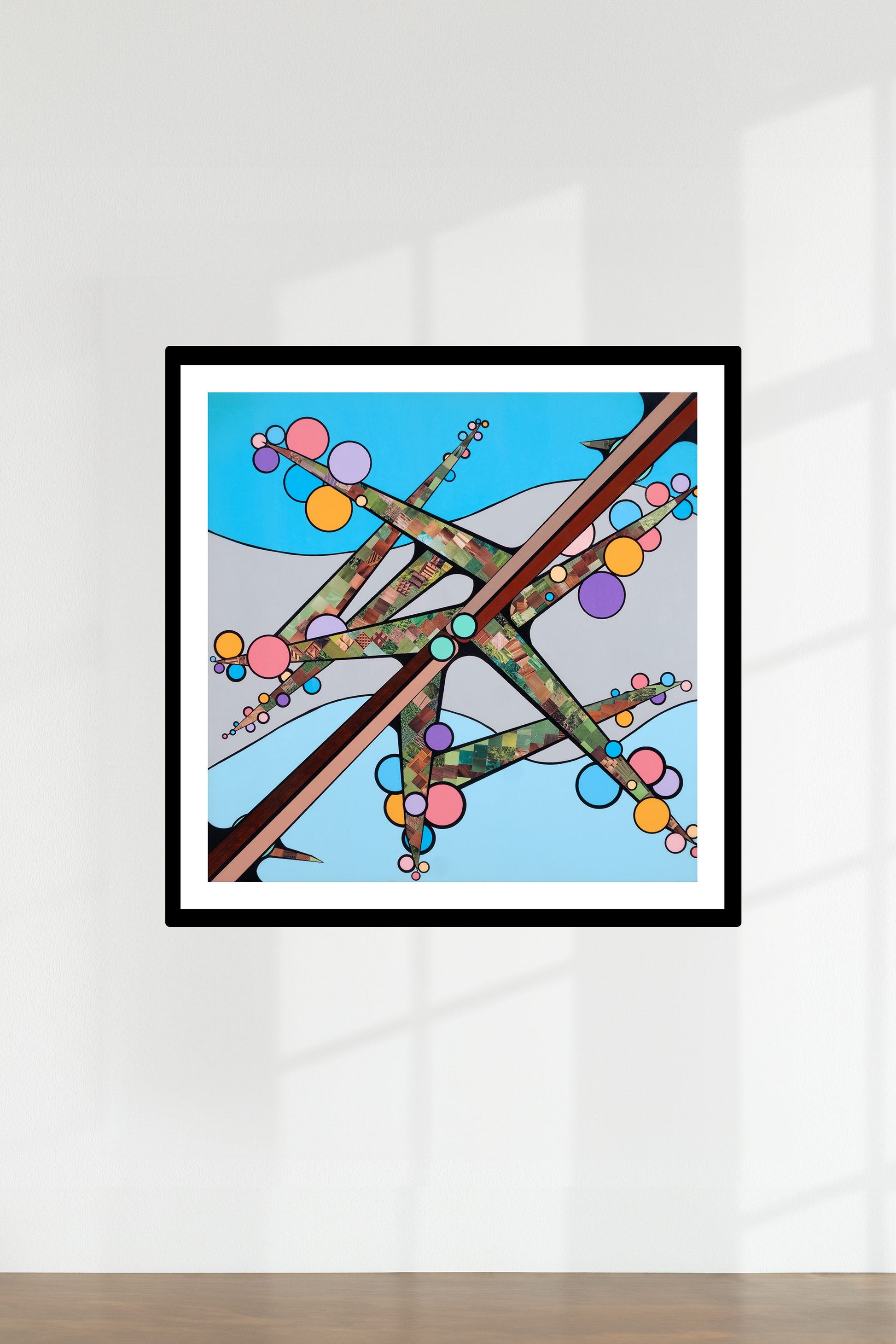 Transform your space with this unique geometric abstract art print, showcasing an eye-catching arrangement of colorful circles, lines, and intersecting shapes against a tranquil blue background. The design combines bold, earthy textures with lively pops of color, creating a balanced and intriguing composition that invites the viewer to explore its details. Perfect for adding a modern, artistic touch to any room, this print is both sophisticated and playful, making it an excellent addition to a living room, bedroom, or office.