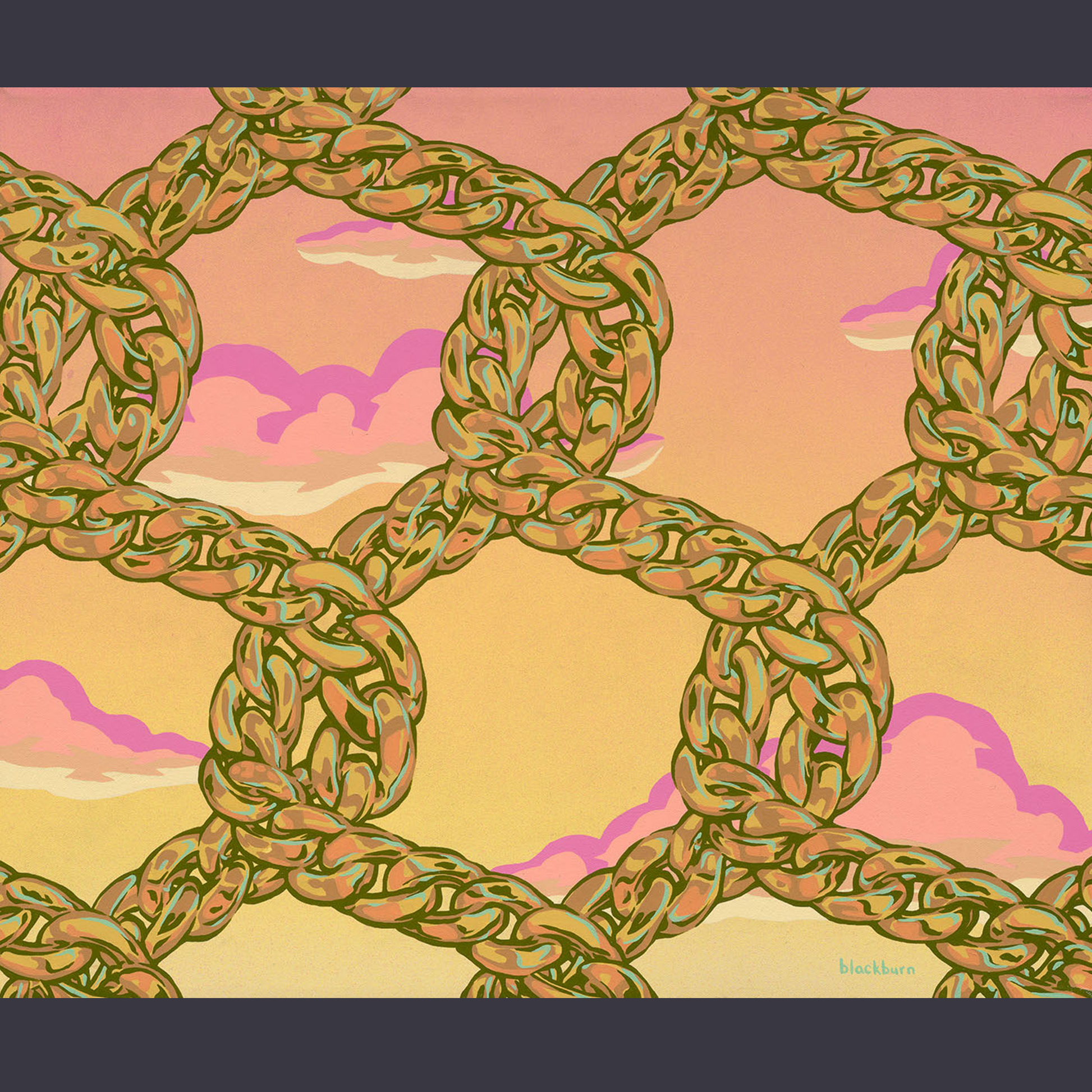 Golden links, endless skies—this bold print blends strength and serenity in a dreamlike visual loop. Thick, interlocking chains rendered in warm olive and brass tones stretch across a soft, pastel sky where clouds shift from peach to blush to lavender. The background glows in gradients of sunset orange and golden yellow, infusing the composition with warmth and surreal calm.
